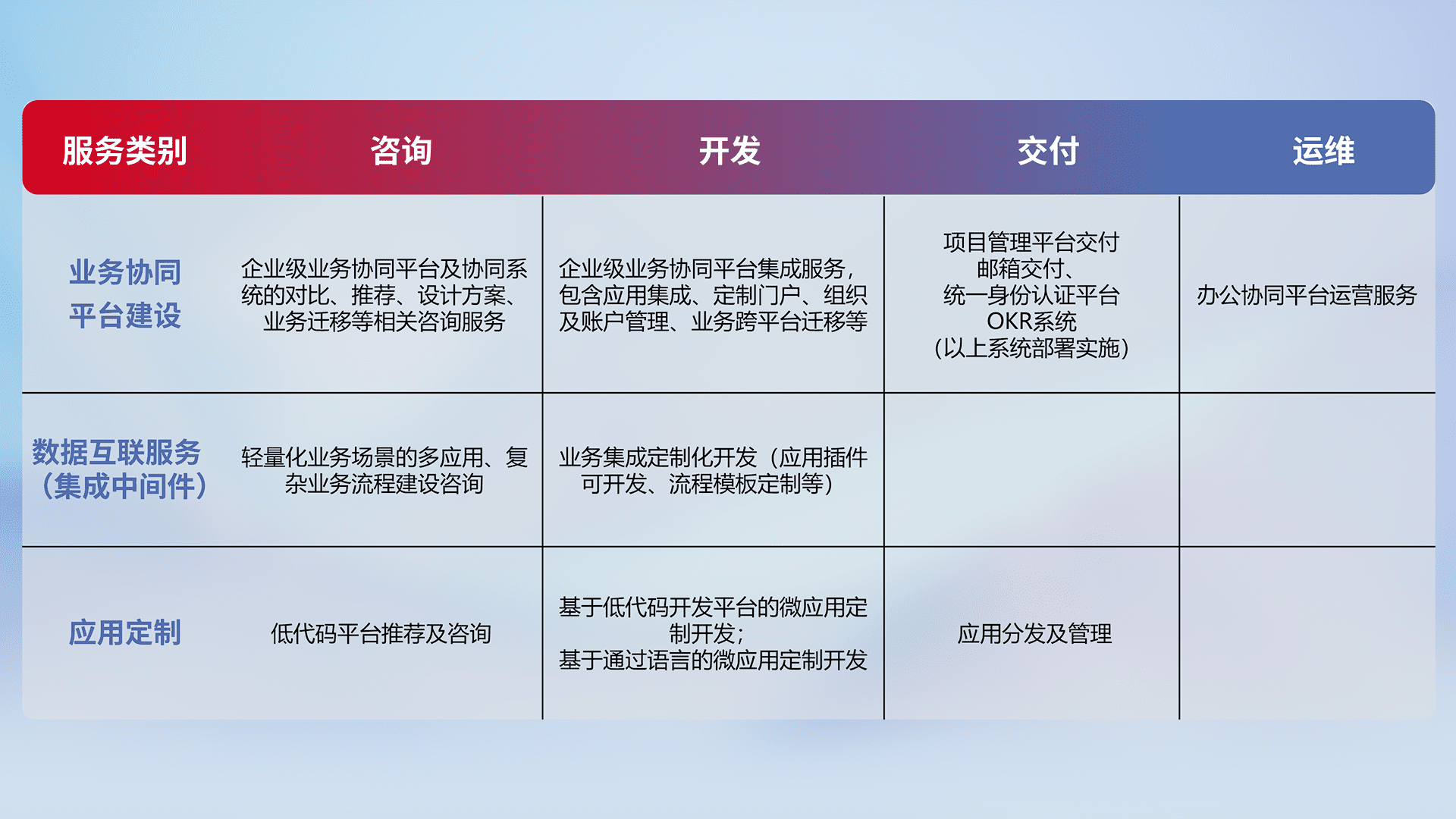 针对钉钉、、企微、、、、IDaas等平台级产品提供产品的规划、、方案、、、、交付、、、、定制化开发等服务,,,实现如统一协同办公、、智能客户服务、、、、混合会议管理、、智能数据查询、、等业务场景,,实现数字化转型。。。。