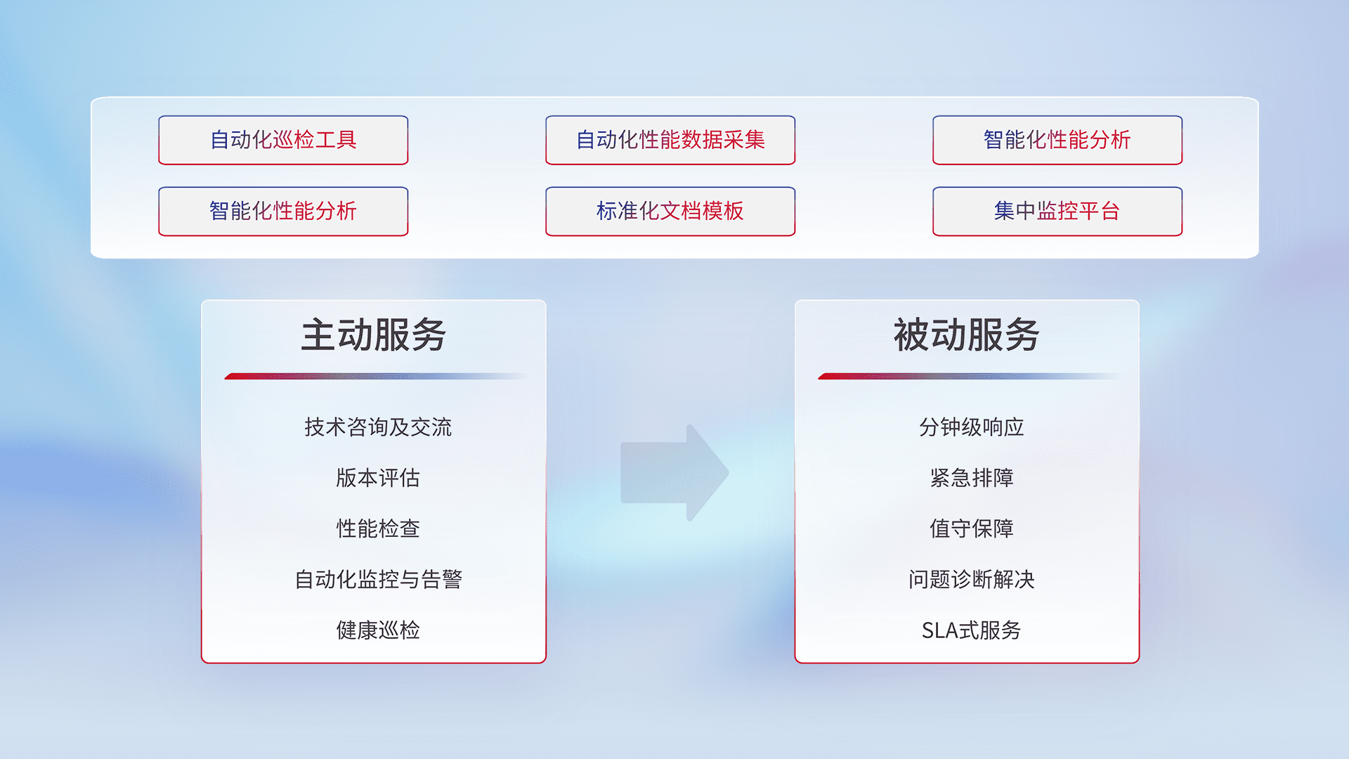 智能化工具和标准化文档,,保障服务质量,,,提供主动服务(包含技术咨询、、、、版本评估、、、、性能检查、、、、自动化监控与告警、、、健康巡检)和被动服务包含(分钟级响应、、紧急排障、、、、值守保障、、、、问题诊断解决、、、SLA服务)。。